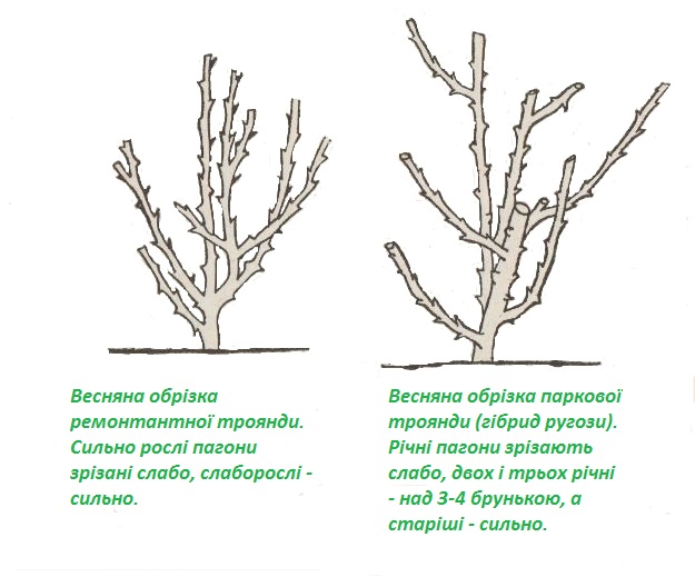 Кущ потрібно вкоротити на третину, щоб пагони були близько 50 см. Необхідно зрізати сухі, гнилі, старі та хворі гілки, також ті, що ростуть всередину троянди. Біля коріння також слід прибрати молоді пагони. Зрізи потрібно робити під кутом 45 градусів, 5-7 цьогорічних пагонів на квітці потрібно залишити.